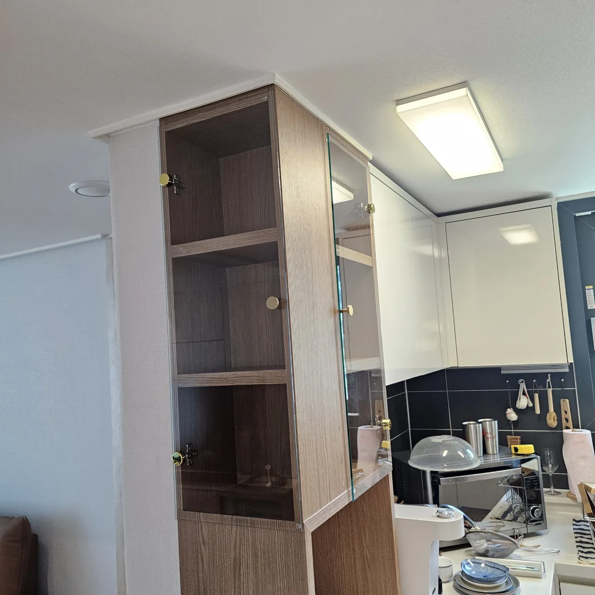 오픈 선반에 슬라이딩 레일과 함께 맞춤 제작한 유리문을 설치한 시공 사례입니다.